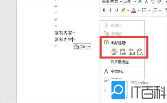 2. 然后鼠标定位到需要粘贴内容的位置后,按快捷键“Ctrl+V”就可以粘贴内容。也可以右击鼠标后,在粘贴选项中选择粘贴的样式粘贴内容。