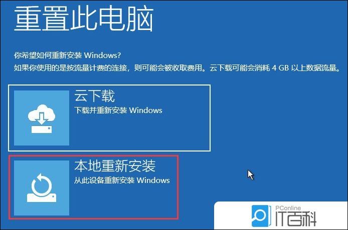 4、 重置此电脑下,可以选择【云下载(下载并重新安装 Windows)】,或选择【本地重新安装(从此设备重新安装 Windows)】;