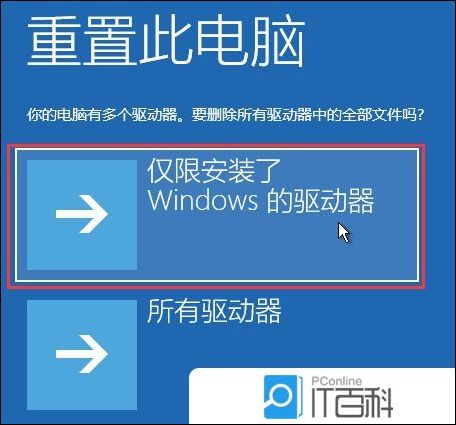 5、你的电脑有多个驱动器。要删除所有驱动器中的全部文件吗?选择【仅限安装了Windows 的驱动器】;