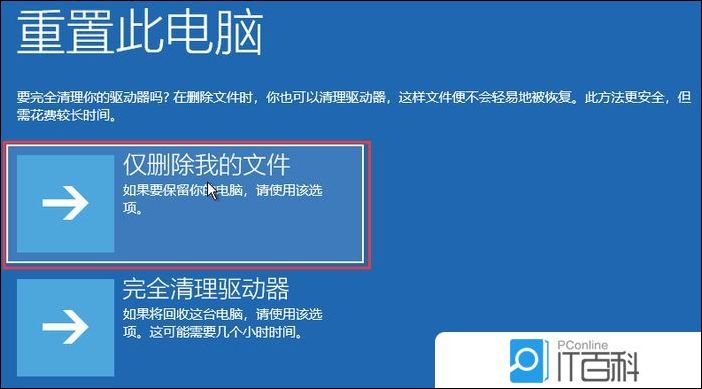 6、要完全清理你的驱动器吗?在删除文件时,你也可以清理驱动器,这样文件便不会轻易地被恢复。此方法更安全,但需花费较长时间。选择【仅删除我的文件(如果要保留你的电脑,请使用该选项)】;