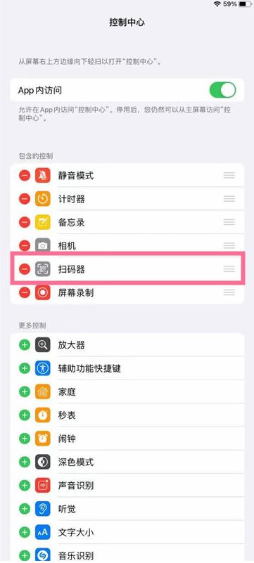1、从设置菜单中点击控制中心,把扫码器添加到控制中心就可以了。