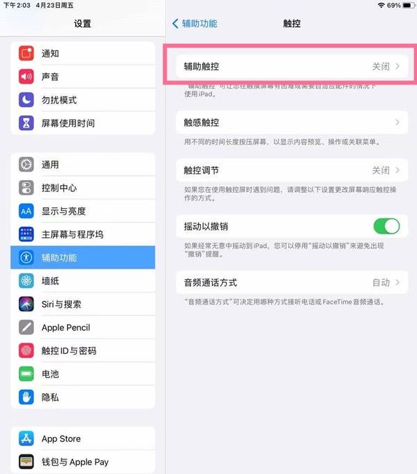 1、在设置菜单中找到 辅助 功能,选择触控。