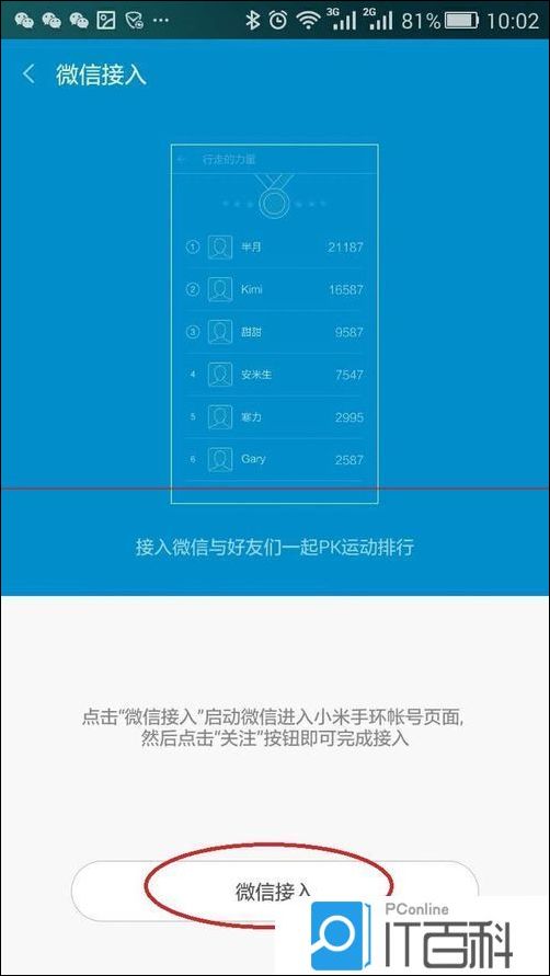 5、接下来会跳转到微信应用,并显示“小米手环”的微信号,点击“关注”按钮继续。关注成功以后,我们直接点击“进入公众号”按钮。随后就可以直接在微信中的小米手环公众号里,直接获取当前行走的实时步数,排行榜等信息了。