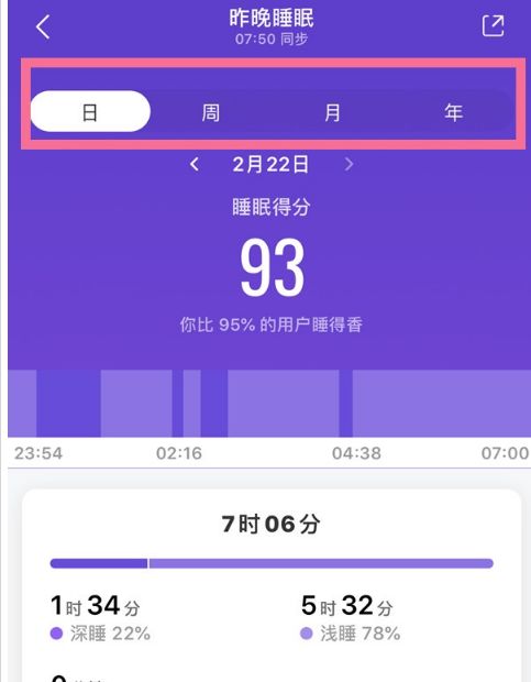 2、点击日、周、月、年即可查看详细的睡眠数据。