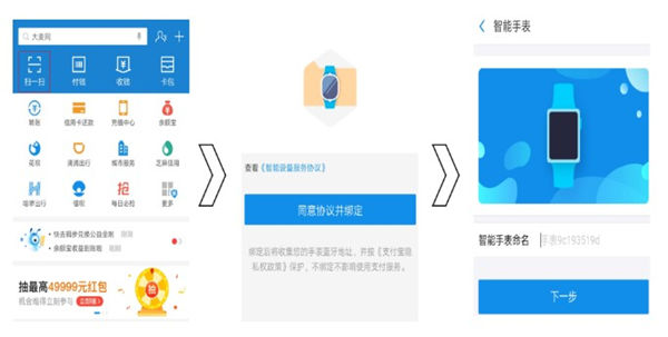 2、打开手机上的支付宝 App,使用“扫一扫” 扫描 手环上的二维码,进入设备绑定页面,点击 “同意协议并绑定”,进入绑定环节。