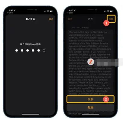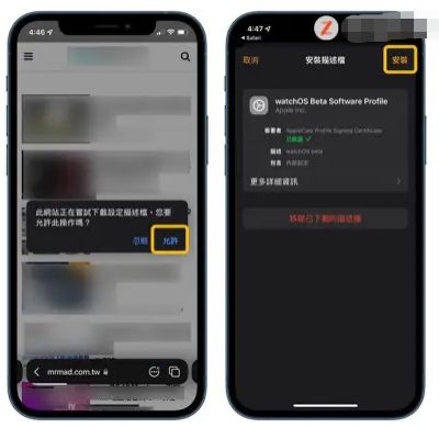 第一步、打开苹果手机的Safari 浏览器 ,点开描述档网址,当弹出来【此网站正在尝试下载设定描述档】的操作提示时,点击【允许】,随后会立马跳转到watchos8测试版描述档的页面,在右上角点击【安装】