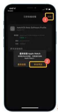 第三步、最后会跳出来是否要重新启动iPhone,点击【稍后再说】。再点击右上角的完成,即可完成watchos8测试版描述档的安装
