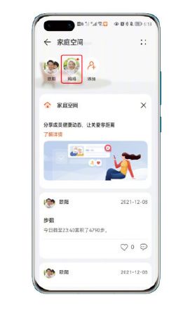 1、打开华为 运动 与 健康 app,点击进入家庭空间,然后点击想要查看的成员 头像 进入。