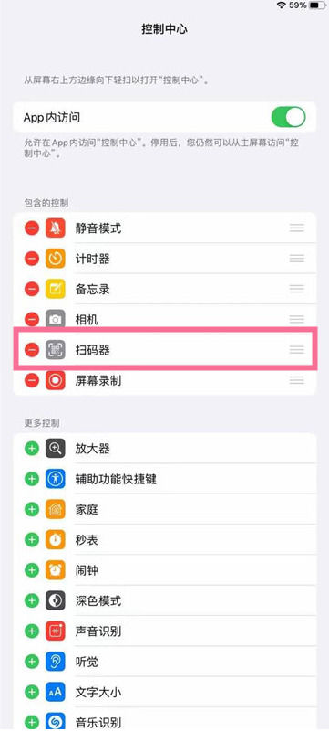 第一步:从设置菜单中点击控制中心,把扫码器添加到控制中心就可以了。