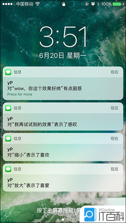 分别表示:喜爱、喜欢、不喜欢、笑出声、感叹、困惑。点击之后对方就能看到你对他这条消息Push消息中,也会把状态展示出来。
