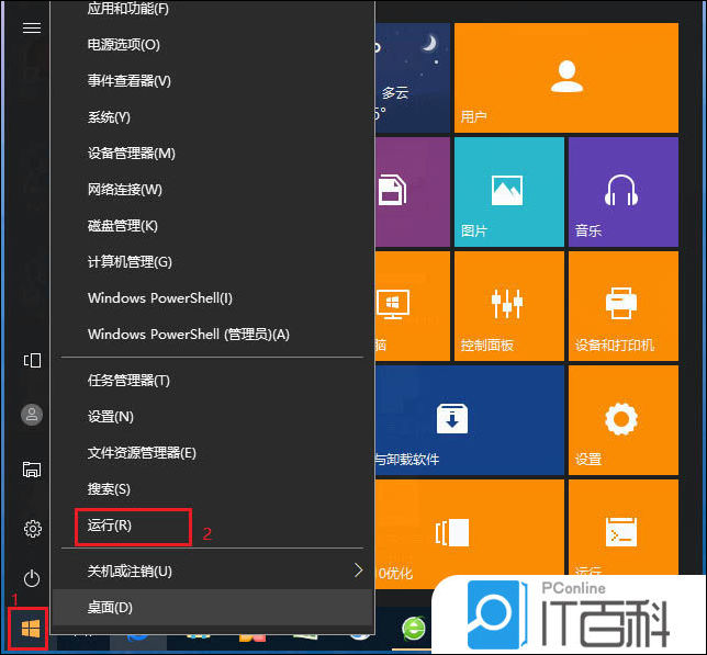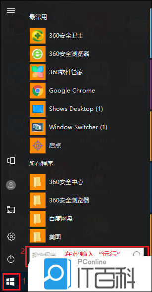 1)win10电脑——点击如图注释1处所示,单击鼠标右键选择图中注释2处【 运行 】