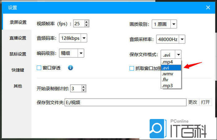 3、在保存文件格式栏, 将默认的MP4格式修改成avi模式 ,此模式比MP4更稳定。