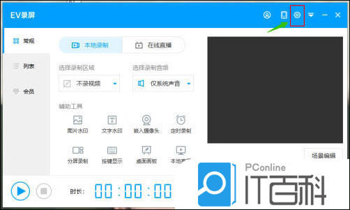 1、打开EV录屏软件,点击最上面的齿轮样的图标,进入 设置窗口