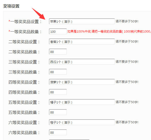 3.怎么做微信大转盘的关键地方,就是微信大转盘的奖品设置,一共6个奖项,不填写则不会被转到,商家可以根据实际情况来添加奖品,主要填写好奖品的名称和数量,写0则代表不会被抽取到。