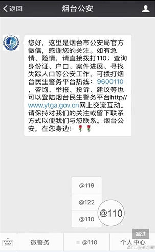 3、这样一来,如果在遇到了紧急情况的时候。就可以通过公众号下方的@110按钮,就可以一键呼叫烟台市公安局,并且进行视频通话了!而且微信还会将你所在的位置使用腾讯地图进行实时的上传哦!
