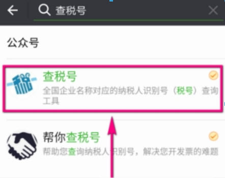 在该页面中输入“查税号”,点击【搜索】,点击如图所示的公众号。