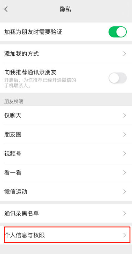 1、打开微信我的页面选择设置中的隐私进入,在隐私板块最下方就可以看到新增的个人信息与权限选项。