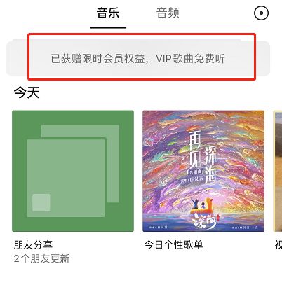 第四步:之后在首页上知道【已获赠限时会员权益,VIP歌曲免费听】,所以就可以轻松的畅听歌曲了;