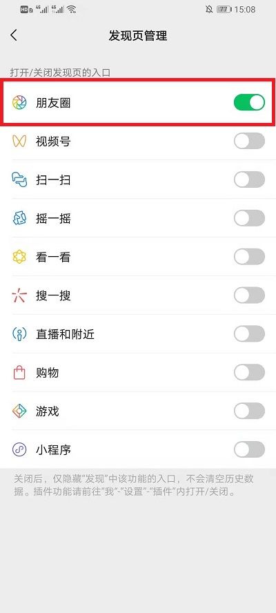 5、在【发现页管理】界面中我们可以点击打开朋友圈的后面的按钮就可以让朋友圈重新出现了。