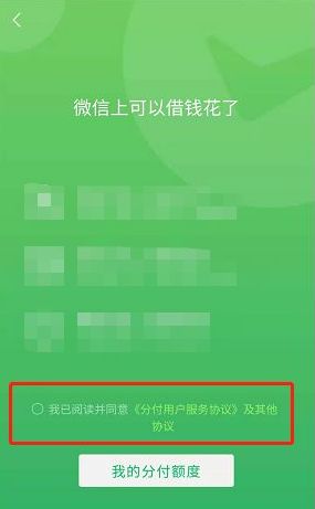 2、然后在分付界面中点击选中协议,同意开通,然后点击【我的分付额度】;