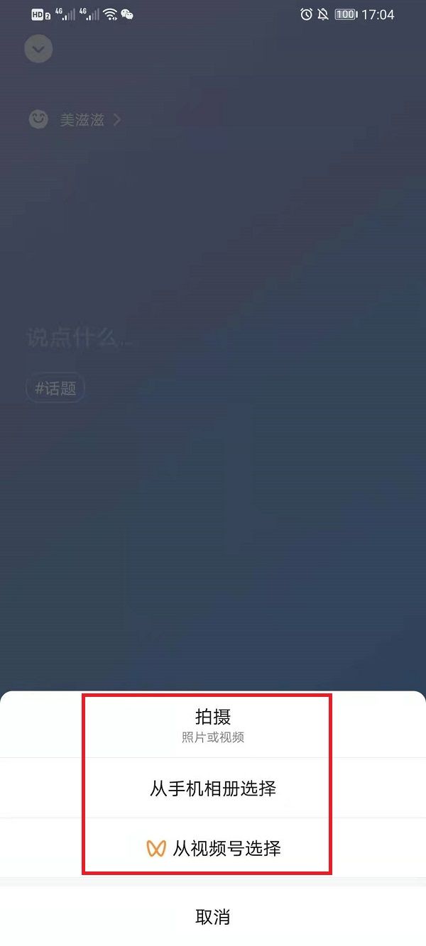 3、然后在弹出的选项中可以选择手机相册的照片,也可以选择拍摄照片还有视频号。