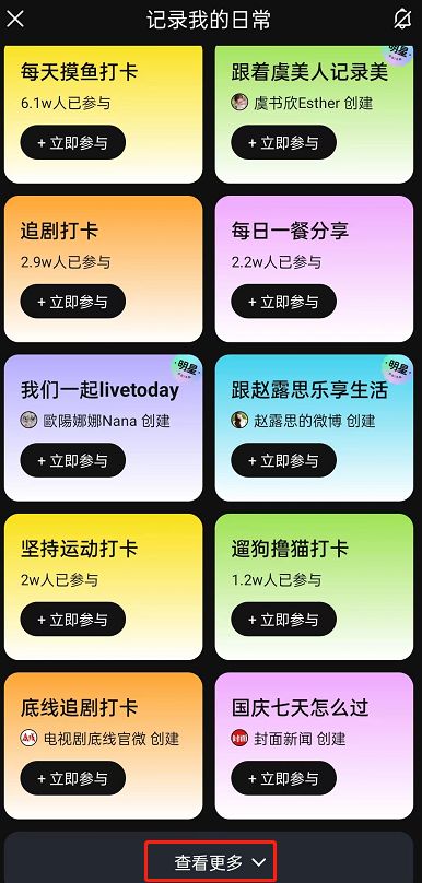 6、回到记录我的日常,点击查看更多。这里还有更多话题,您可以选择喜欢的进行 打卡 记录。