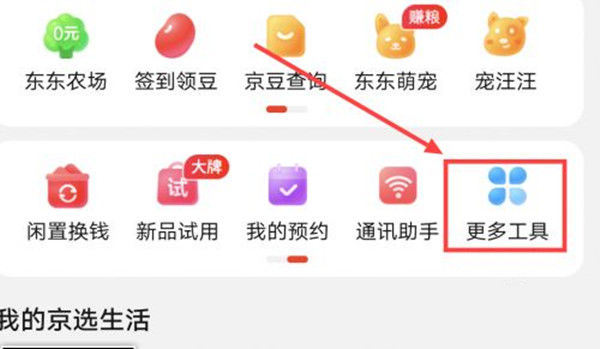 2、在个人中心页面中向右滑动,在【我的京选生活】上方的栏目中,点击【更多 工具 】。