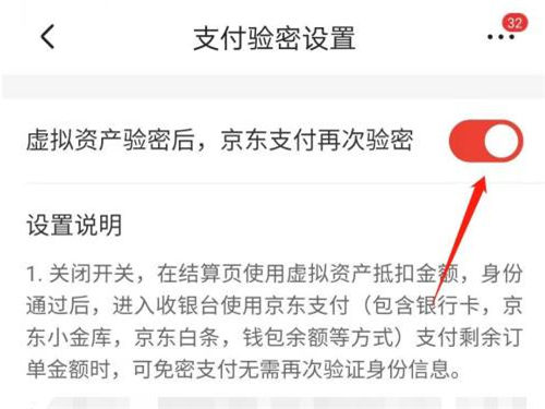 第三步:关闭虚拟资产验密后,京东支付再次验密功能即可。