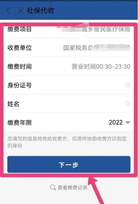 在新页面中输入缴费人员的身份证等信息点击下一步,进行缴费。