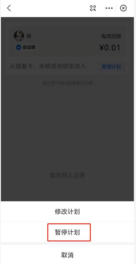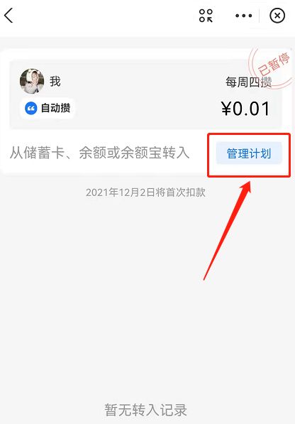 6、当计划中出现已暂停字样即为关闭成功。后续就不会再从银行卡及余额转入到小荷包了。