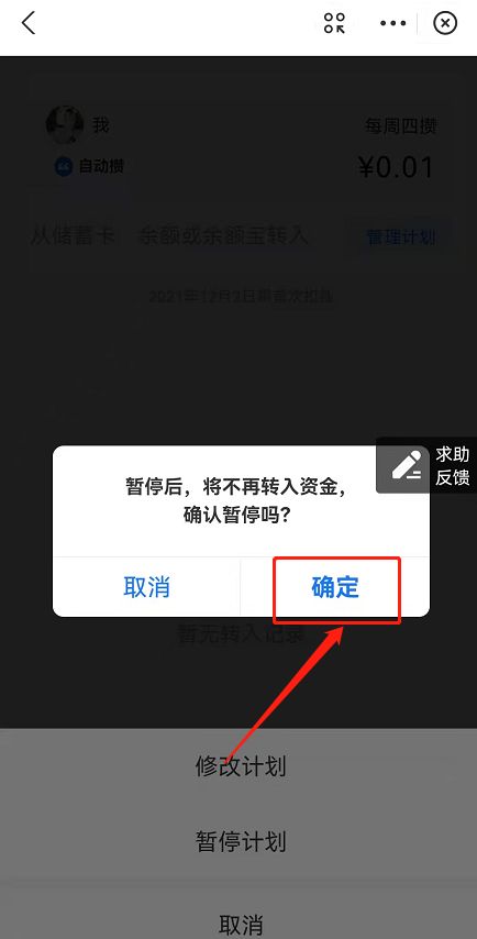 5、页面会提示暂停后不会转入资金,继续确定即可暂停。
