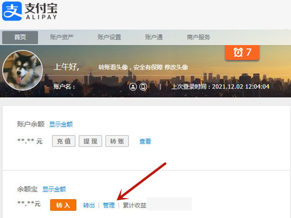 2、登录支付宝后,在余额宝中选择管理。