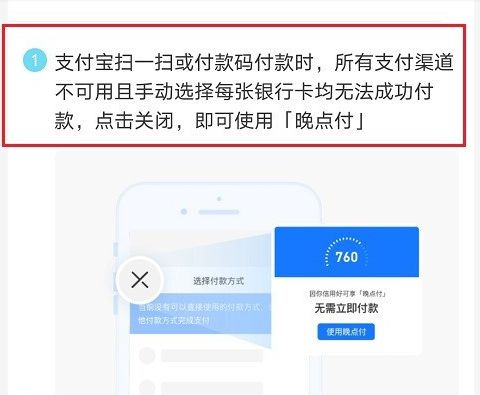 4、第四步开通晚点付之后,我们使用支付宝扫一扫或者付款码所有支付渠道不可用的时候,可以使用晚点付