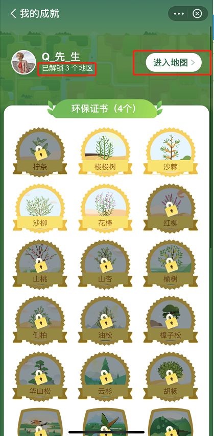 3.可以看到自己拥有的全部树木和保护地种类,同时还可以进入地图查看保护地区