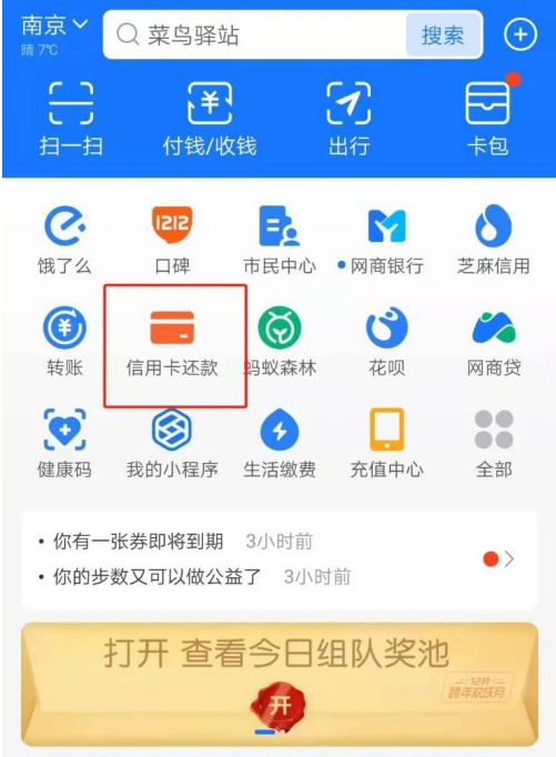 2、然后点击信用卡还款,首页没有的话用户们可以点击上方 搜索 。