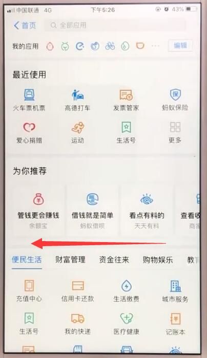 2、进入更多的页面后,在下面便民 生活 的一栏向左滑动,