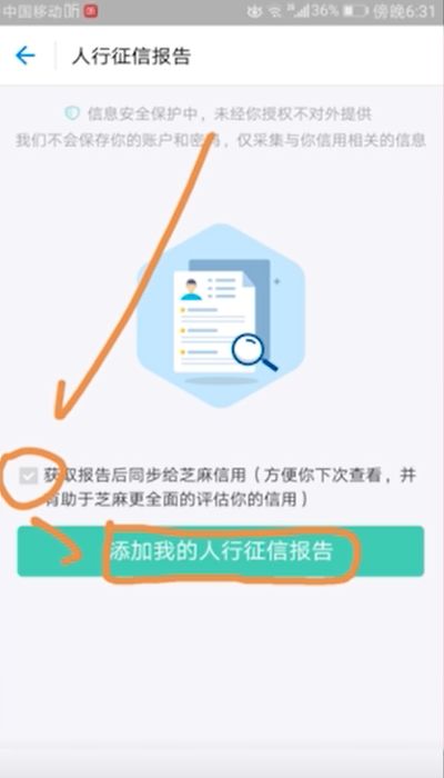 4勾选“获取报告后同步给芝麻信用”,点击“添加我的个人征信报告”。