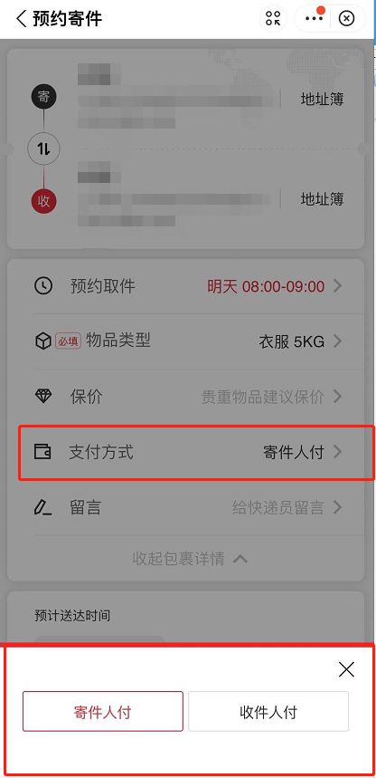 4、找到【支付方式】,选择【收件人付】就可以啦!