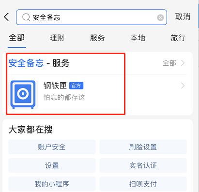 1.在支付宝首页输入“安全备忘”进行 搜索