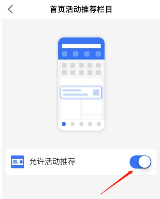 4、点击 允许活动推荐 右侧按钮开启,就能在首页第一时间查看到各项活动了。