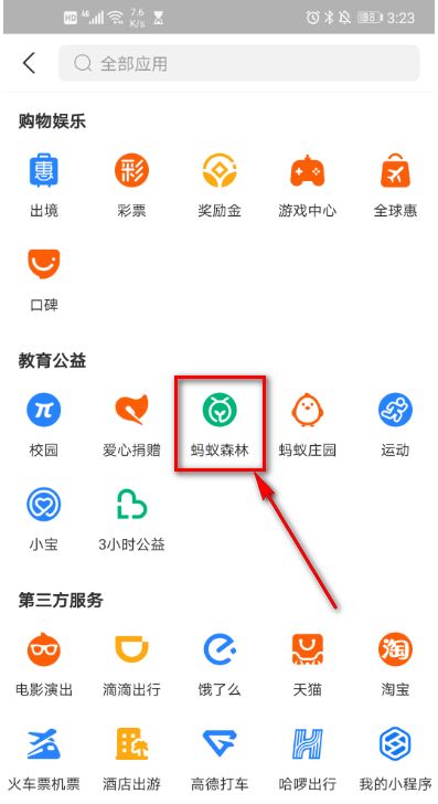 3、 在 教育 公益处,点击蚂蚁森林。