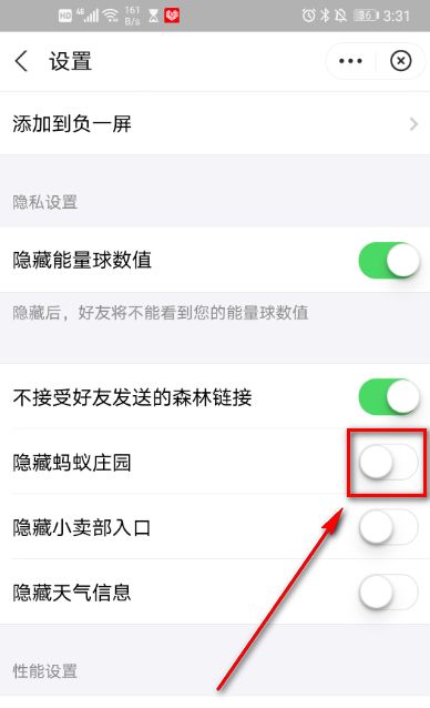 7、 按钮跳转为绿色时,蚂蚁庄园隐藏成功。