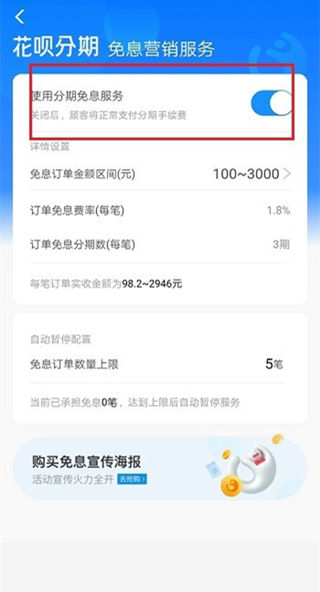 6、点击关闭使用分期免息服务,就关闭了花呗分期收款啦