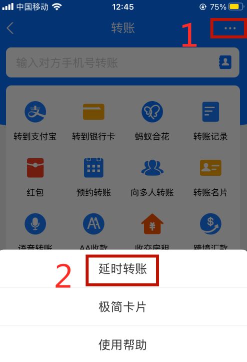3、点击右上角的更多图标,然后点击【延迟转账】。