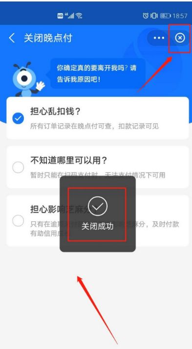 4、随后在打开的窗口层,找到选中“关闭晚点付”选项。