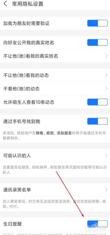5、最后点击箭头指向位置,将开关变成灰色即可关闭生日提醒。