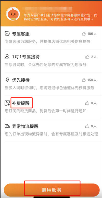 在专属客服服务的开启页面中,用户通过点击下方的启用服务,即可开启专属客户服务包含补货提醒通知。