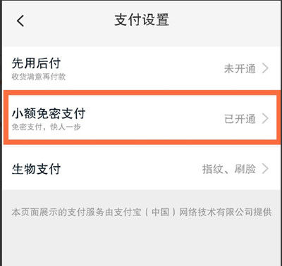 在支付功能的页面中,用户可以看到关于小额免密支付功能的选项,点击进入功能详情。