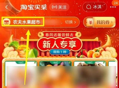 打开手机淘宝app,点击首页的【淘宝买菜】按钮,进入功能页面。