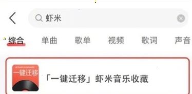 2、打开 网易云音乐 app, 搜索 虾米,就能在综合栏目看到 一键迁移虾米音乐收藏 选项
